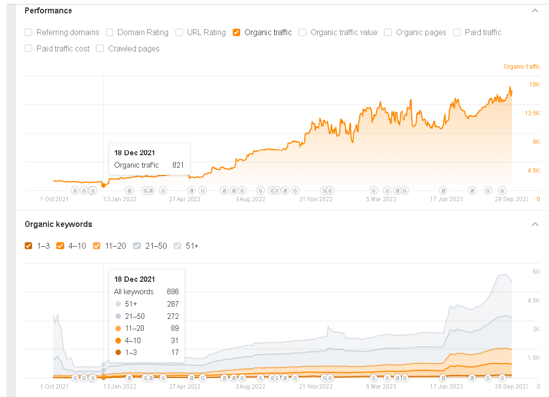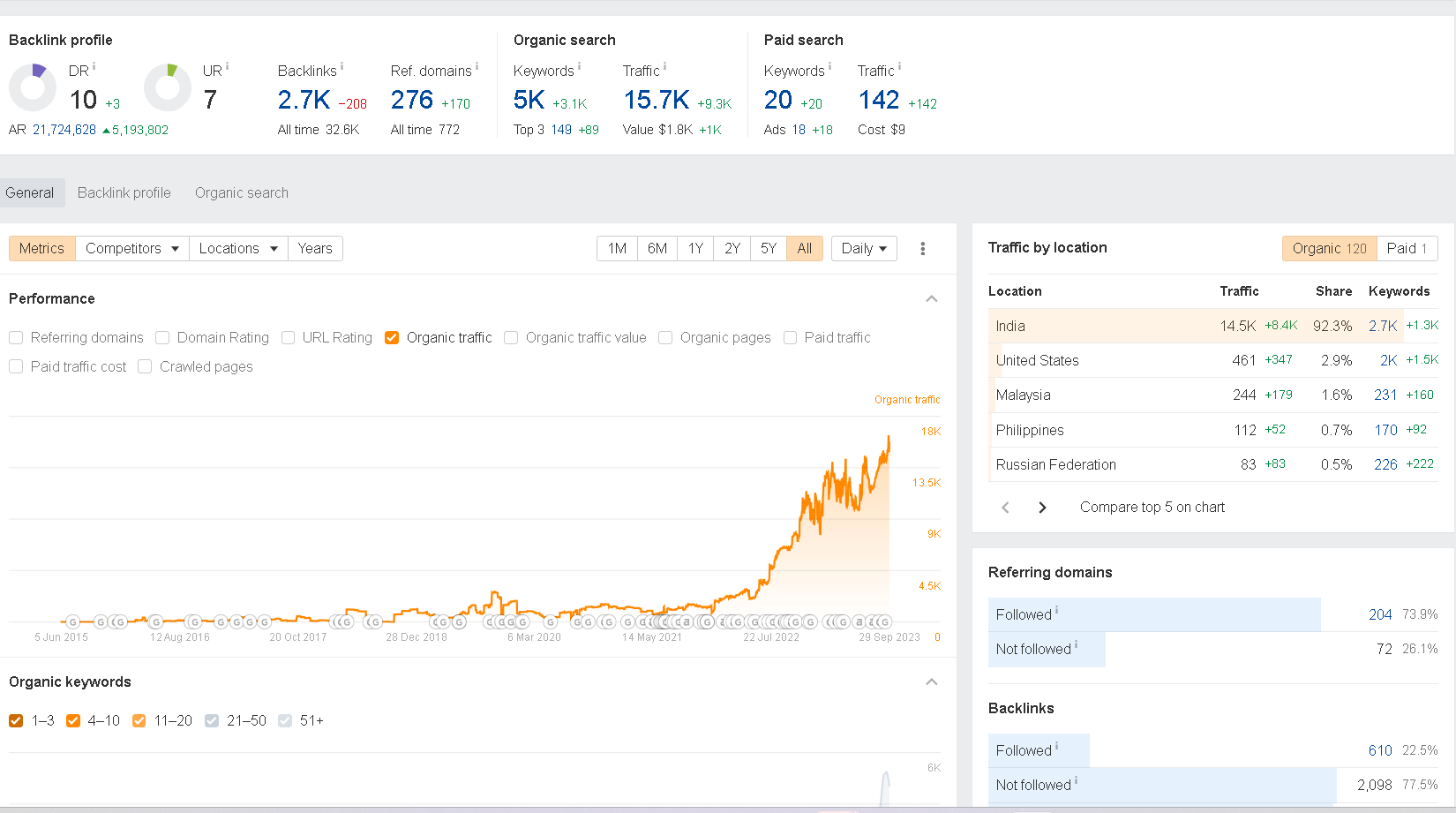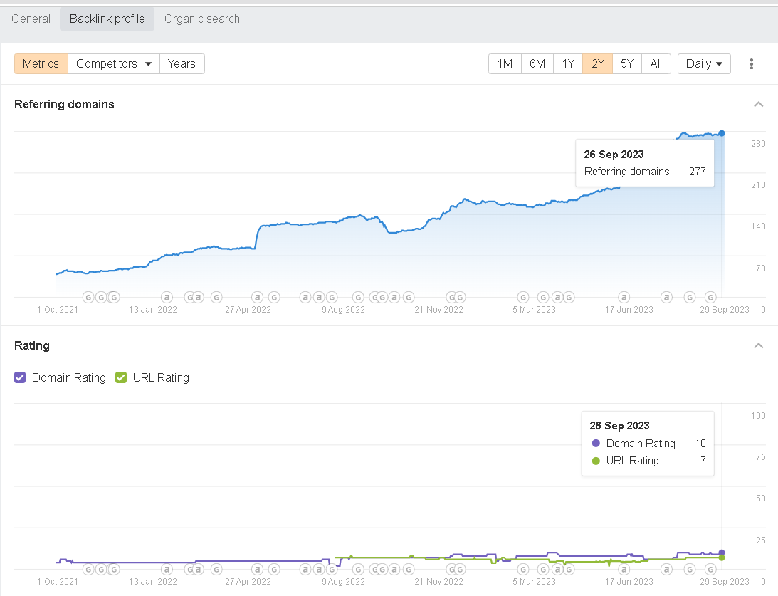 - The number of referring domains skyrocketed to 277 by September 2023 – an almost 5 times increase.