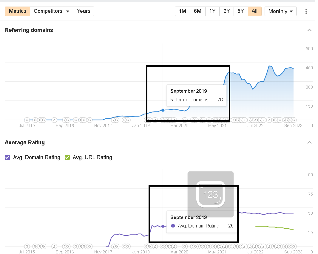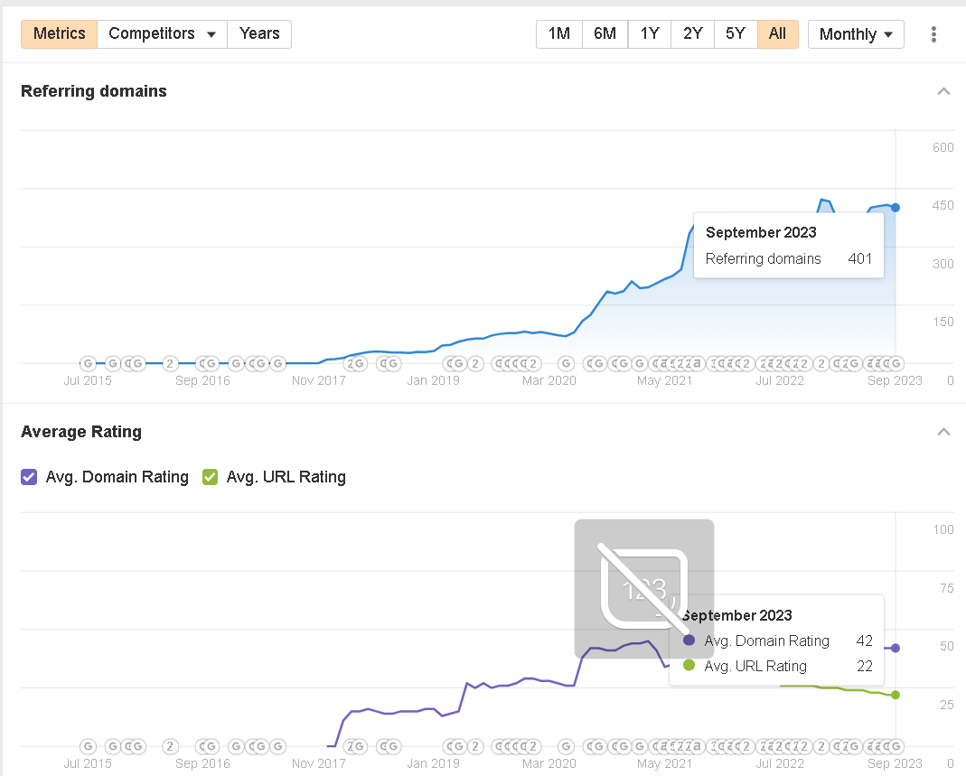 π Referring domains? A jaw-dropping increase from 76 to 401.
