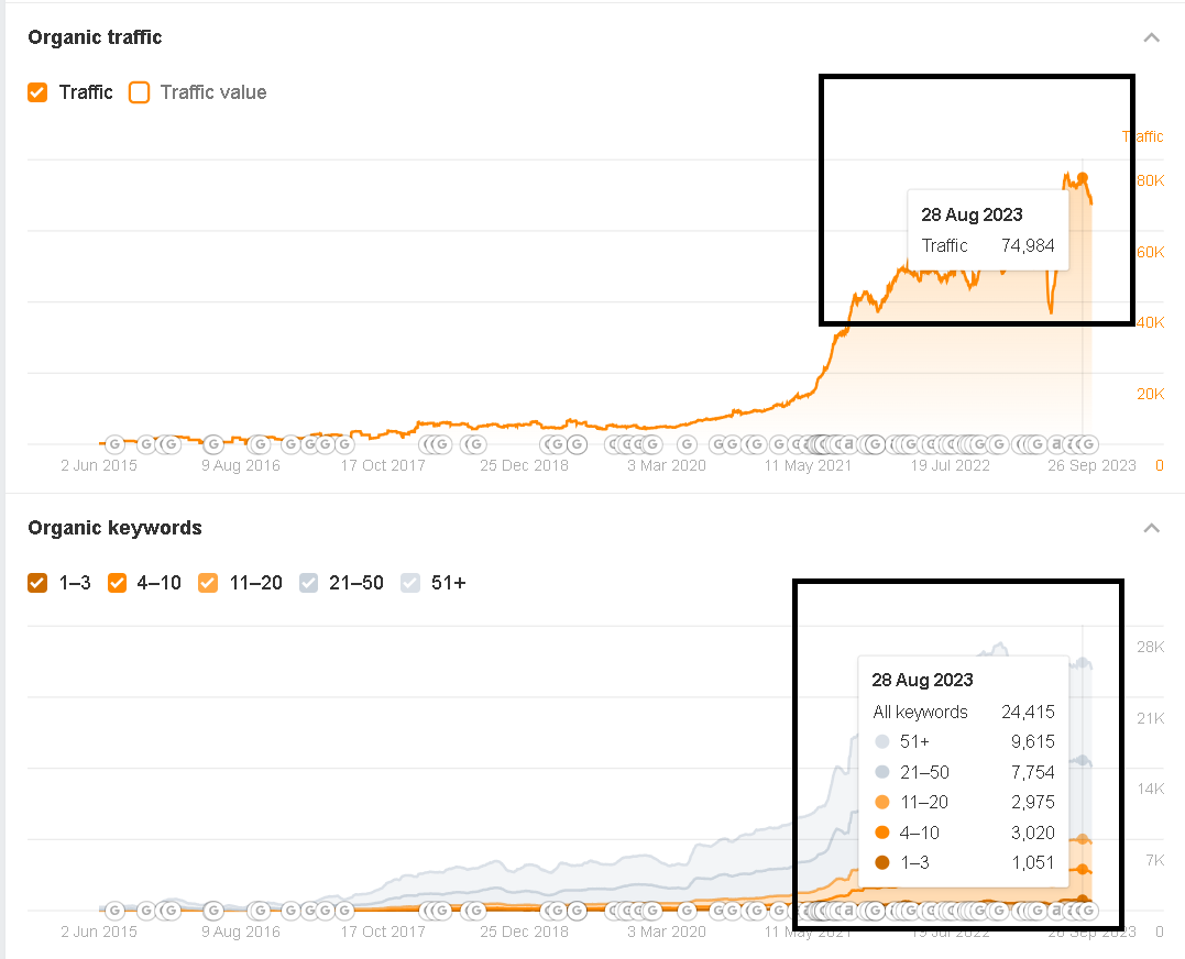 - Traffic Value: The firm’s website’s traffic value was initially at $17,025. By September 2023, this value had been elevated to an astounding $201,744, highlighting not just the quantity but the sheer quality of traffic being driven to the site.